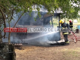 (De la Redacción, por Salto Hoy) - Poco antes de las 08:30 de este jueves 21, una dotación del cuerpo activo de bomberos voluntarios, a bordo del móvil N° 46, concurrieron ante un llamado telefónico al camino de tierra que se halla entre la empresa Bastari y CUSA, a metros de Av. Virginia Gemme.  Pese a la intervención de los servidores, el fuego deboró el galpón / Foto: Salto Hoy Por motivos que hasta el momento se desconocen, había tomado fuego un galpón construido con chapas y maderas, dentro del cual se guardaban diversos elementos, entre ellos comida para caballos. Las llamas, de proporciones, fueron extinguidas en pocos minutos por los servidores públicos que no pudieron evitar los daños, que fueron totales. Personal policial colaboró en el lugar y afortundamente no hubo que lamentar personas heridas.  Según información a la que accedió "Salto Hoy", que trabajó en el lugar, el galpón es propiedad de Miguel Ángel Farina.