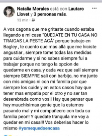 Una trabajadora de la planta de Bagley Salto, firma que tuvo su primer caso de Coronavirus en un empleado, relató a través de las redes sociales un hecho lamentable, que deja ver que esta pandemia no nos ha vuelto mejores personas, si no todo lo contrario: sacó lo peor de nosotros como sociedad.  La falta de empatía, solidaridad y respeto son protagonistas por éstos días, hecho que preocupa y genera dolor.  Natalia Morales es empleada de Bagley. Notablemente indignada, escribió: " A vos, cagona, que me gritaste cuando estaba llegando a mi casa 'Quedate en tu casa y no traigas la peste acá' porque trabajo en Bagley, te cuento que, más allá de que me hiciste angustiar, siempre tomé todas las medidas para cuidarme". Y agregó: "Siempre fui a trabajar porque no tengo la opción de quedarme en mi casa". En ese sentido, la operaria aseguró: "Siempre que salí lo he hecho con barbijo. No me junto con mis amigas ni con mí familia porque siempre los cuidé y en éstos casos hay que tener más empatía por el otro y no ser tan descerebrada como vos". Con dolor e impotencia, Natalia siguió: "Hay que pensar que muchísima gente la está pasando muy mal, y mi compañero junto a su familia, peor".  Y remató: "Quedate tranquila que me voy a quedar en mi casa y vos debería hacer lo mismo".