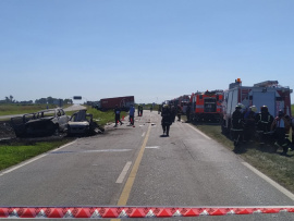 Parte de prensa policial Hoy, personal de la Comisaría de Chacabuco y Sub Comisaría O’higginis, toma conocimiento de un siniestro vial, en Ruta Nacional 7 km 224, en donde por circunstancias que se tratan de establecer, una camioneta Renault Kangoo, la cual era guiada por un hombre domiciliado en Chacabuco, colisiona con camioneta Volkswagen Amarok, conducida por un hombre mayor de edad (48) acompañado por femenina mayor de edad (43) ambos domiciliados en Mercedes y con un camión marca Volvo, de la empresa Andreani, cuyo rodado era guiado por un hombre de 47 años con domicilio en CABA, el cual circulaba en sentido contrario. Producto de la colisión, el conductor de la Renault Kangoo falleció en el lugar. El resto de las personas partícipes del siniestro fueron trasladadas al nosocomio de Chacabuco por lesiones de menor consideración.- Vehículo Amarok y Kangoo, incinerada s totalmente.